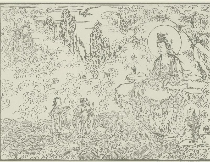 在南印度的普陀洛迦山上,善財童子直擊了「觀自在菩薩於金剛寶石上結跏趺坐,無量菩薩皆坐寶石恭敬圍遶,而為宣說大慈悲法」的說法盛況,觀音並為善財解說了菩薩大悲行門。